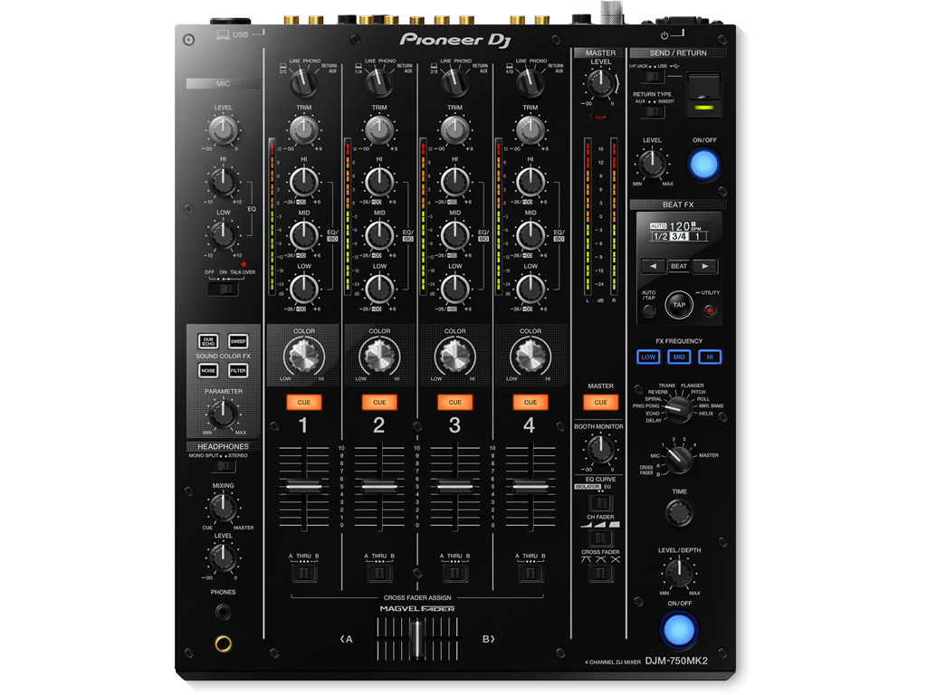 Take the step to the DJ booth seamlessly with the DJM-750MK2, a 4-channel mixer which inherits key features and design elements from the DJM-900NXS2, creating a club-style setup when combined with our professional CDJ or XDJ multi players.